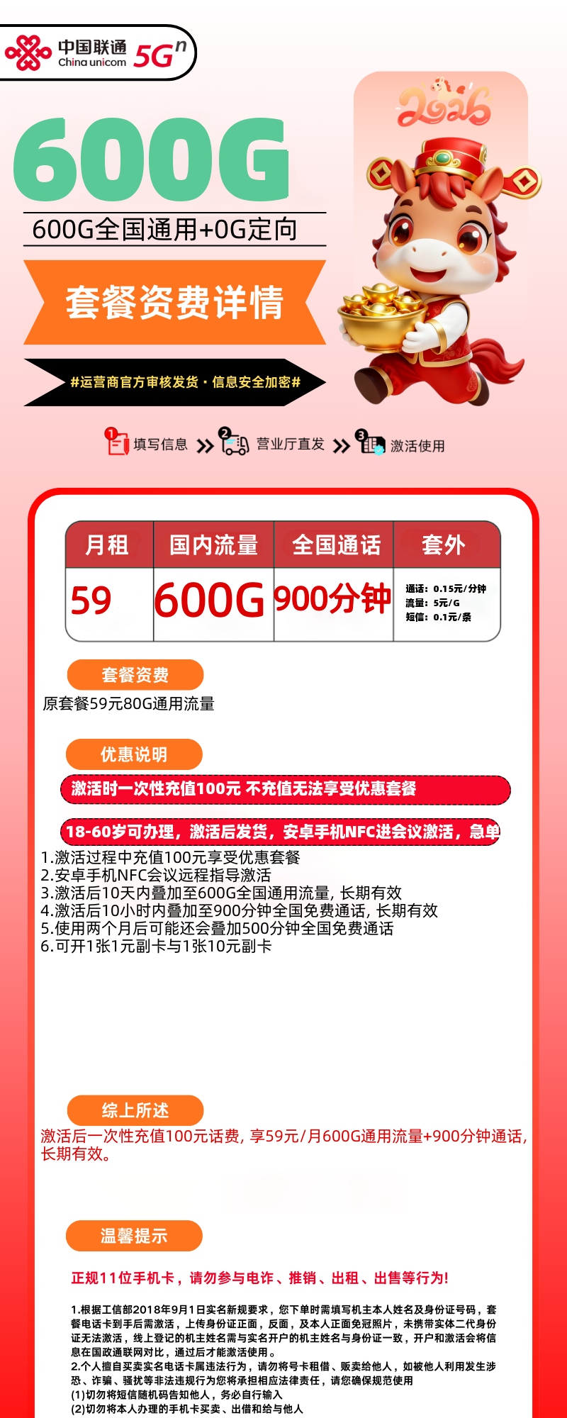 59元600G全国通用流量900分钟全国免费通话,可开1张1元副卡,长期套餐