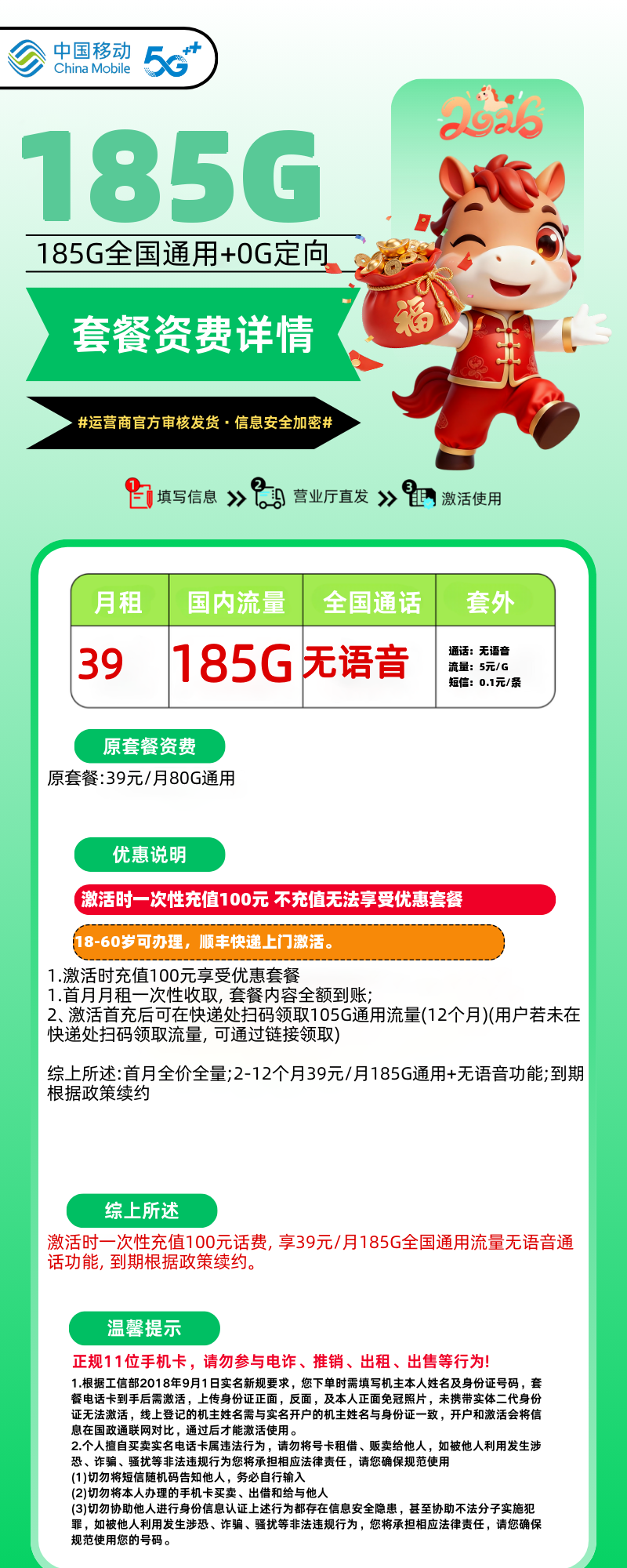 39元185G全国通用流量无语音通话功能,一年套餐,到期后根据政策续约
