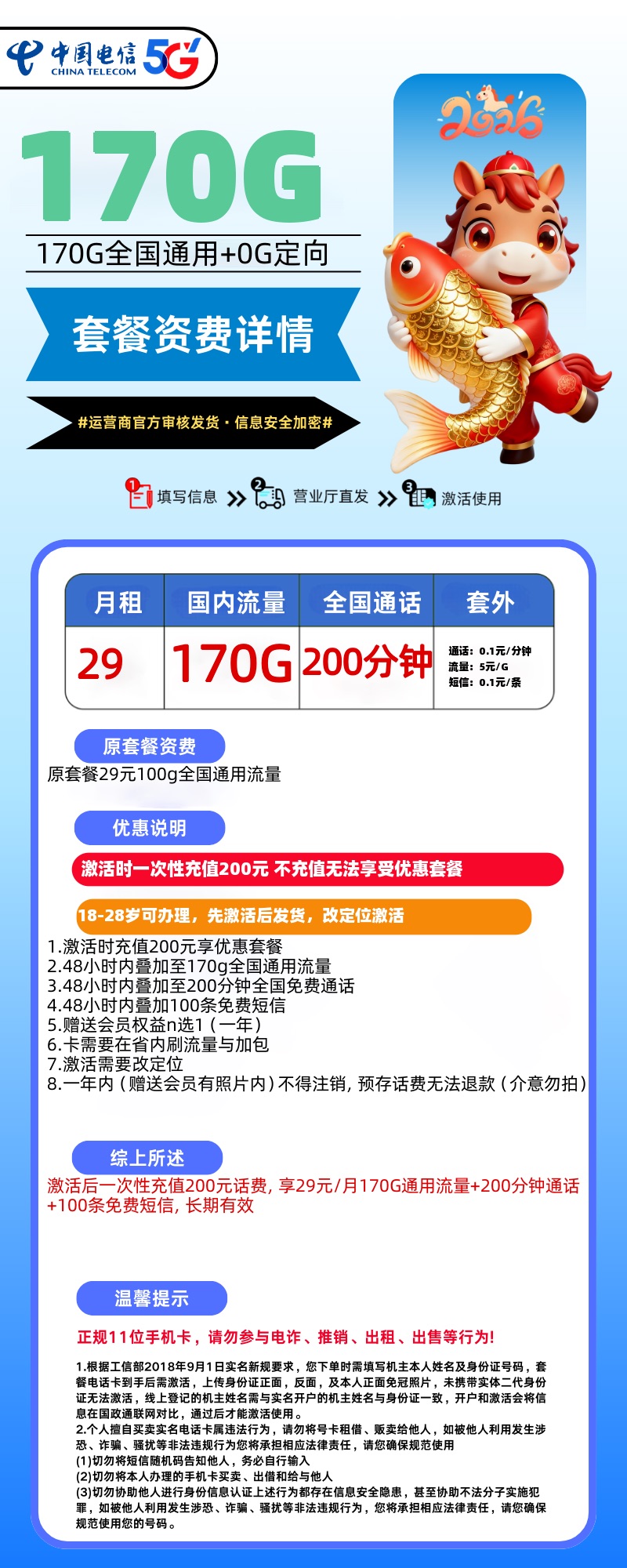 29元170g全国通用流量200分钟全国免费通话100条免费短信,长期有效,赠送一年会员权益,流量可结转