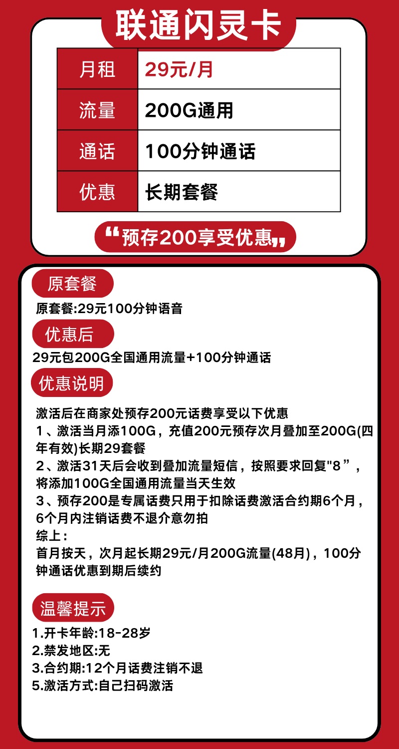 发全国,预存200,首月100G,次月开始长期200G,可以选号
