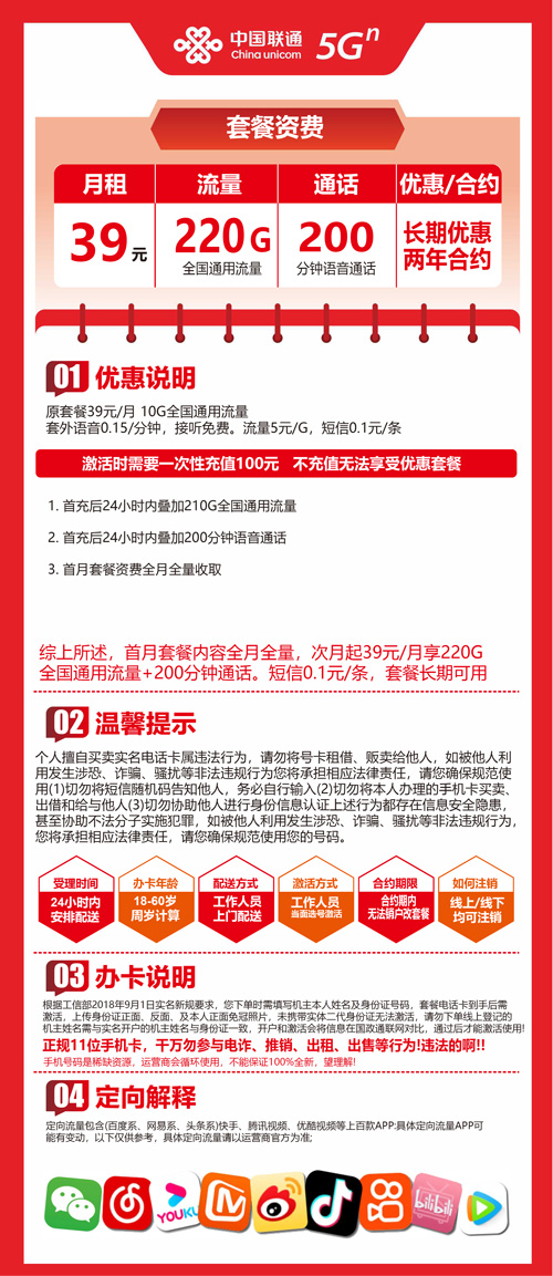 【重庆市】联通流量王38元 209G+200分钟 首充100元 两年合约 长期套餐