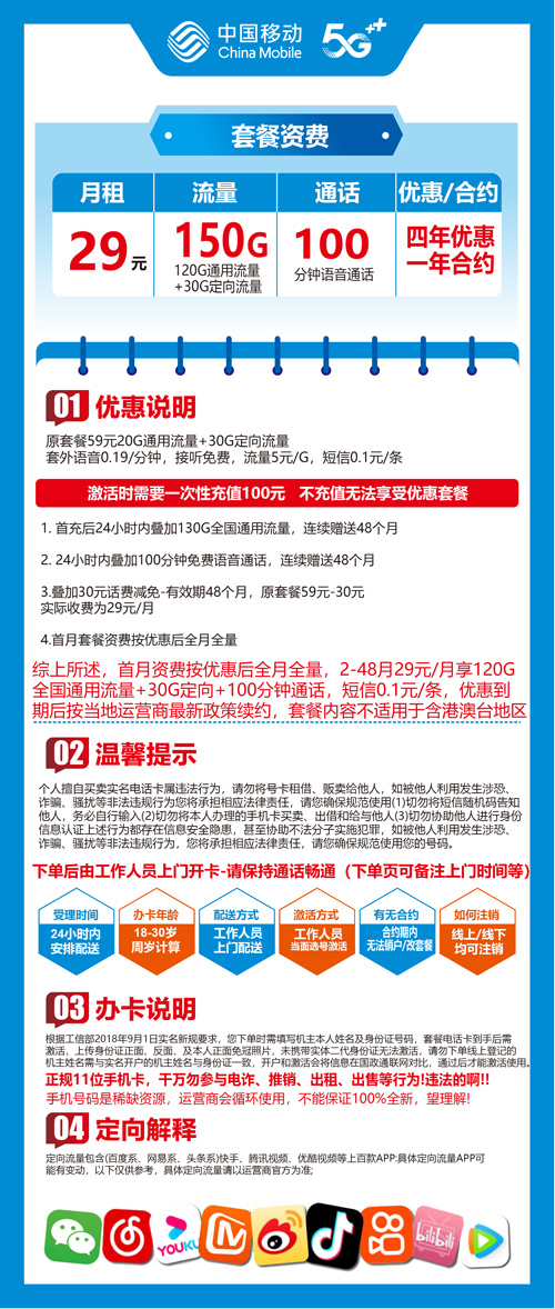 【广东广州】移动29元150G+100分钟 首充100元 四年优惠套餐