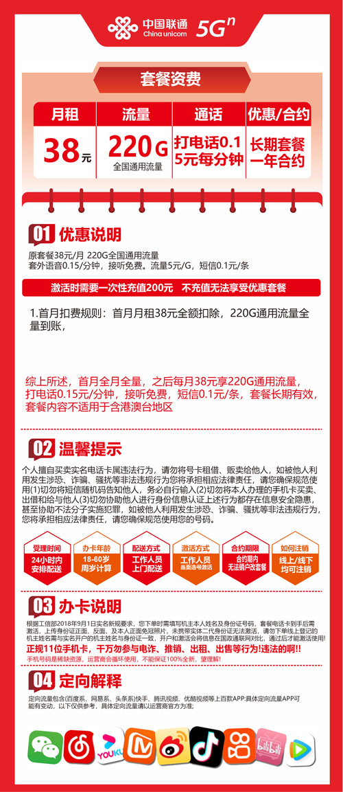 【广东省广州市】联通流量王38元220G 首充200元 长期套餐