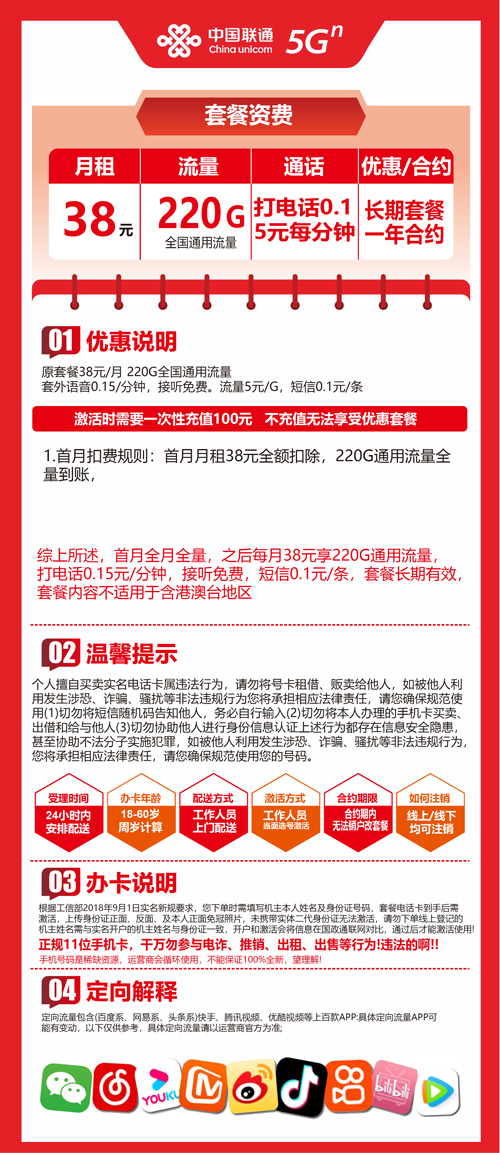 【广东省广州市】联通流量王38元220G 首充100元 长期套餐