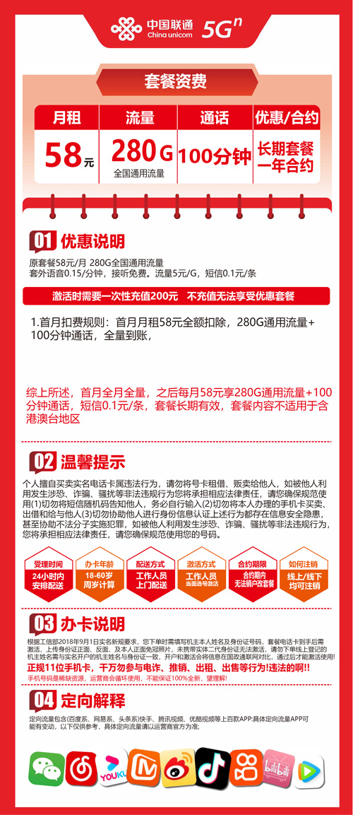 【广东省广州市】联通流量王58元280G+100分钟 首充200元 长期套餐
