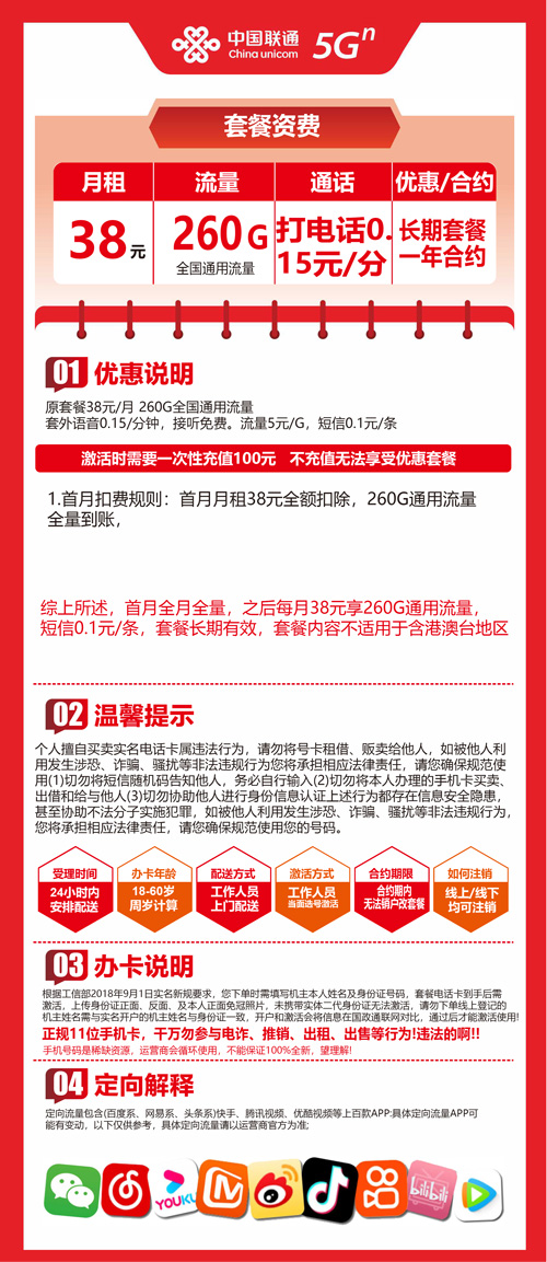 【广东省东莞市】联通流量王38元260G 首充100元 长期套餐