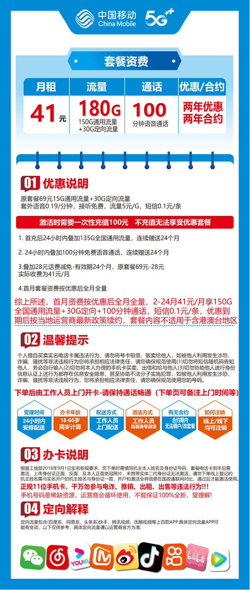 【广东惠州】移动41元180G+100分钟首充100元两年套餐