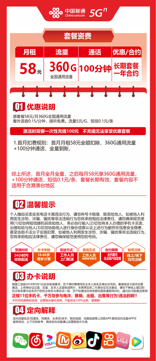 【广东省惠州市】联通流量王58元360G+100分钟 首充100元 长期套餐