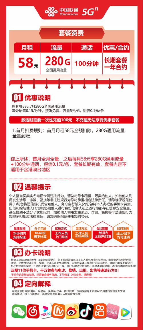 【广东省揭阳市】联通流量王58元280G+100分钟 首充100元 长期套餐