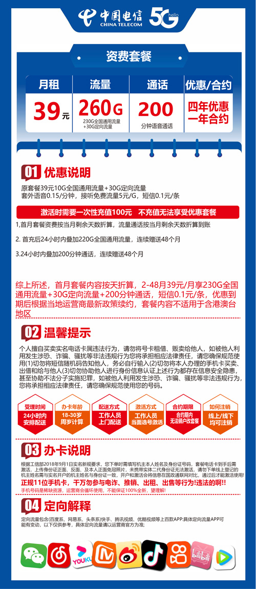 【广东省茂名市】电信流量王39元260G +200分钟 首充100元 四年优惠套餐 18-30岁可办理