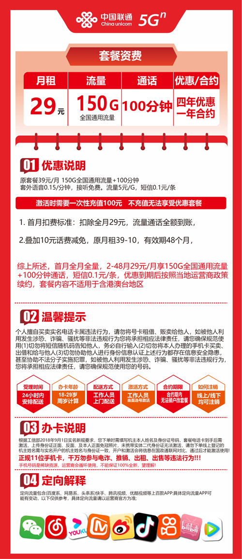 【广东省茂名市】联通流量王29元150G +100分钟 首充100元 四年优惠套餐 到期续约