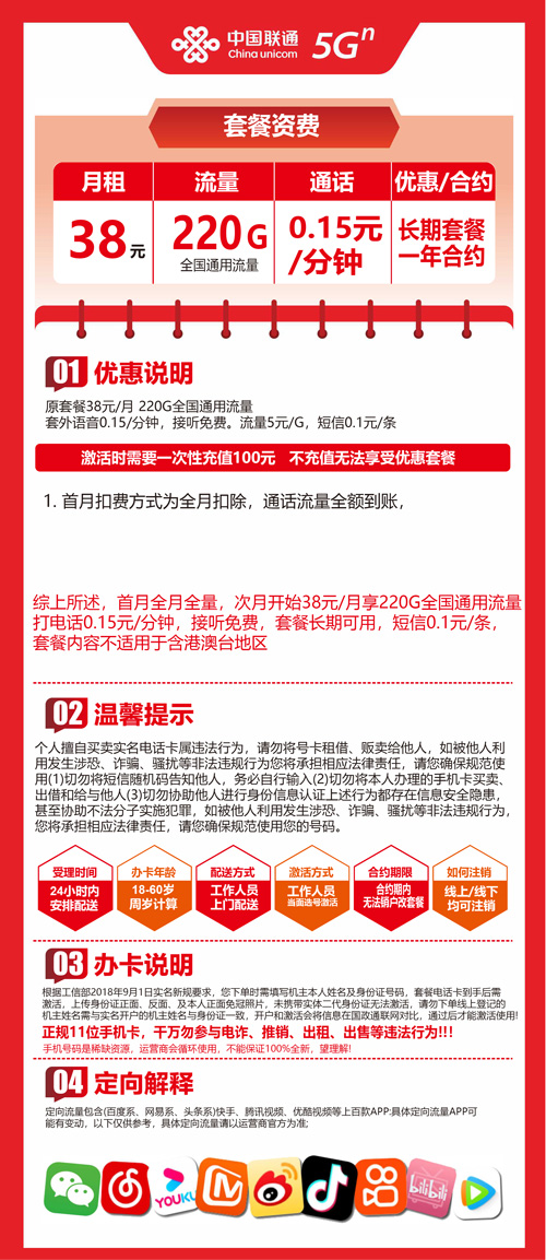 【广东省汕头市】联通流量王38元220G 首充100元 长期套餐