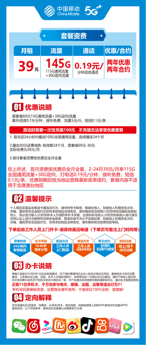 【广东汕尾】移动39元145G 首充100元 两年优惠套餐