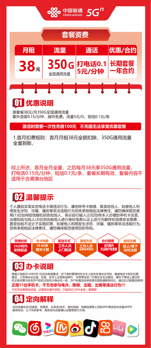 【广东省肇庆市】联通流量王38元350G 首充100元 长期套餐