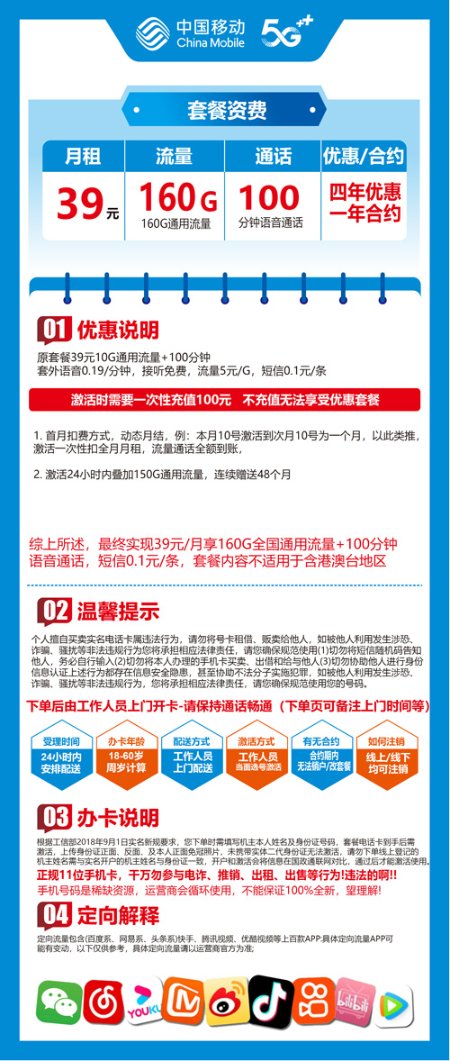 【安徽省合肥市】合肥市移动校园卡39元 160G+100分钟 首充100元 四年优惠套餐
