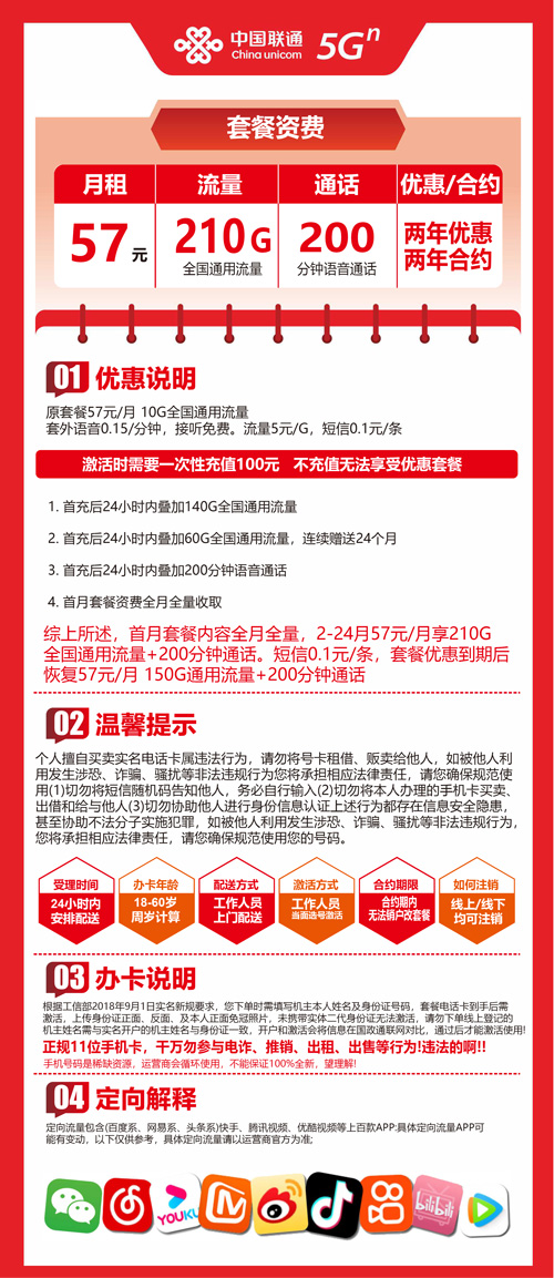 【贵州毕节】联通 57元210G+200分钟 首充100元