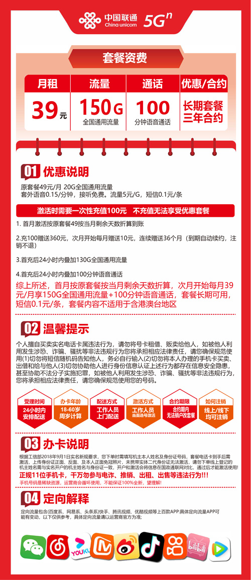 【河北省邢台市】联通流量王 49元 150G+100分钟 首充100元 额外赠送100元 长期套餐