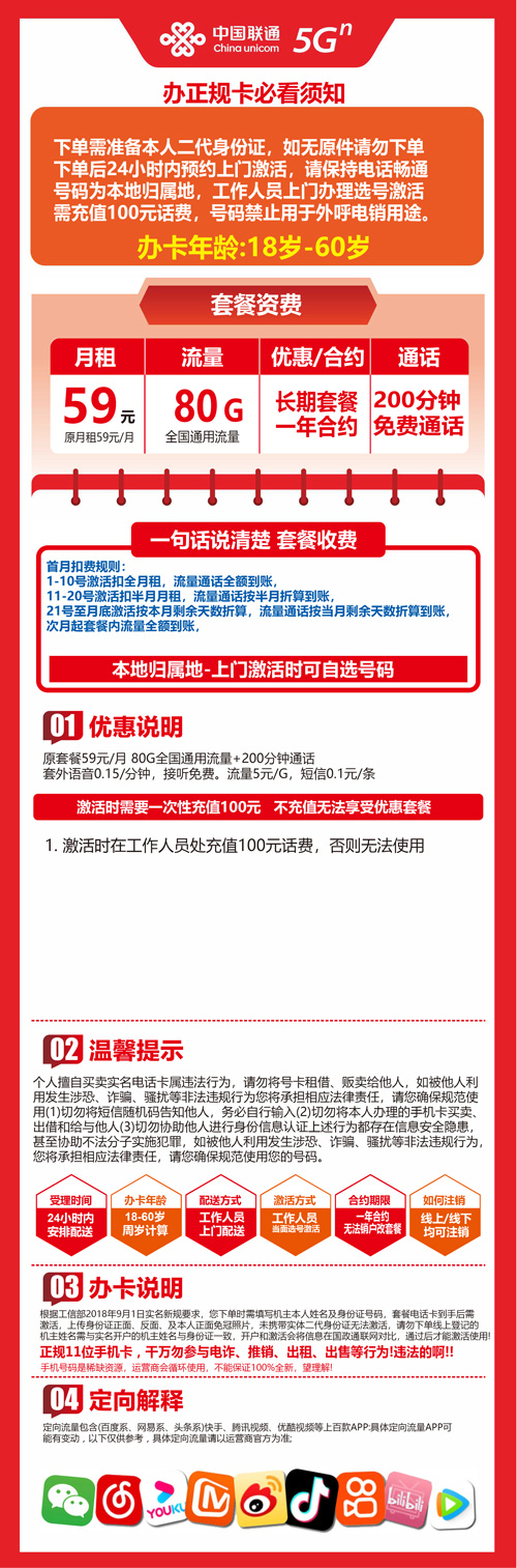 【山西省太原市】联通流量王59元 80G+200分钟 首充100元 长期套餐