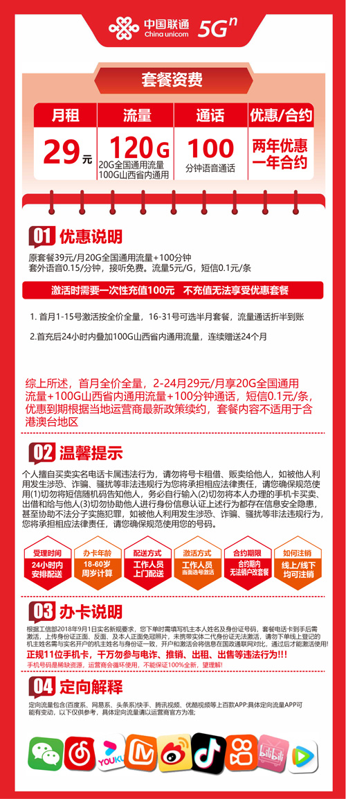 【山西省长治市】联通流量王29元 120G+100分钟 首充100元 两年优惠套餐