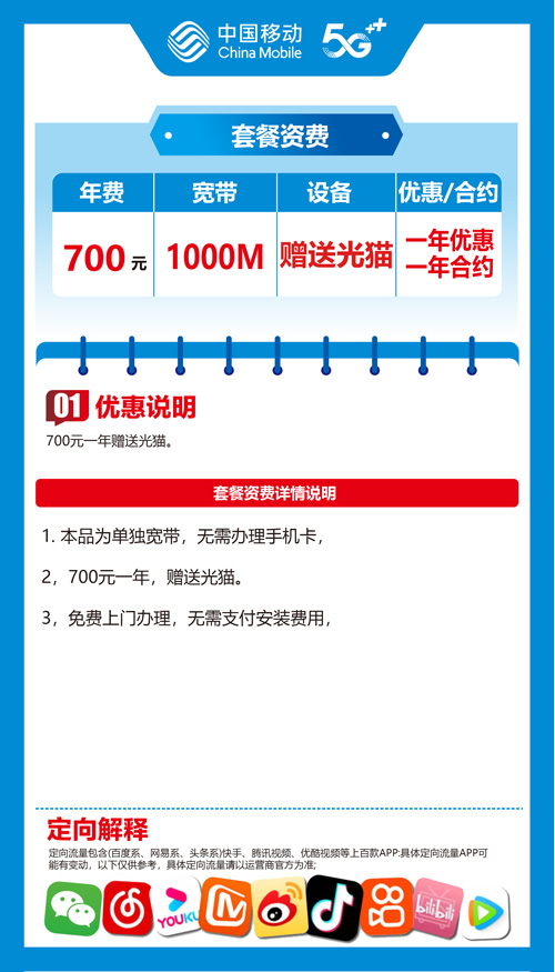 【广东省广州市】广州移动1000M单宽700元包年套餐