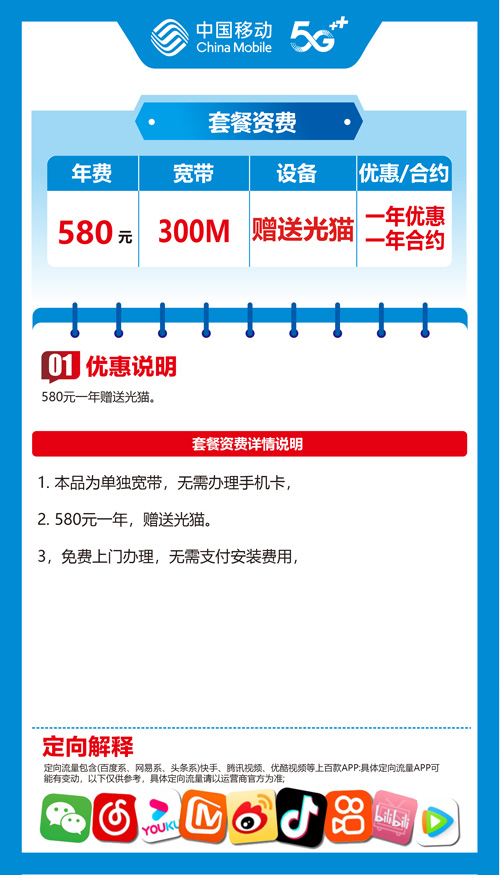 【广东省广州市】广州移动300M单宽580元包年套餐