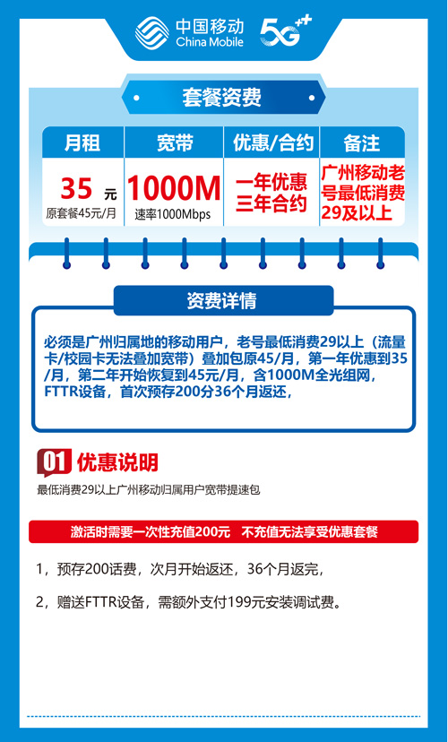 【广东省广州市】广州移动老用户原套餐+35元宽带叠加包 1年优惠期