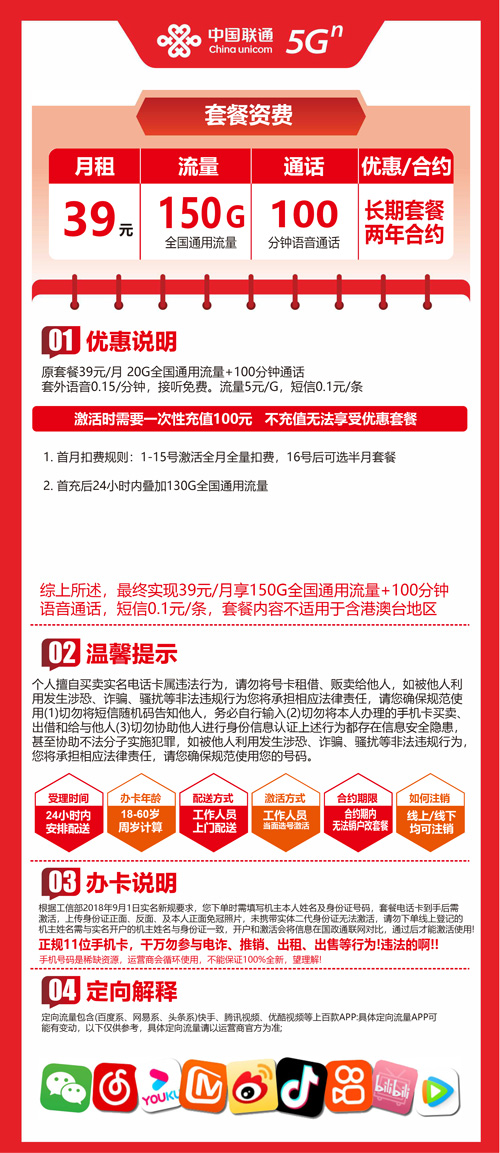 【浙江全省】联通流量王39元150G+100分钟