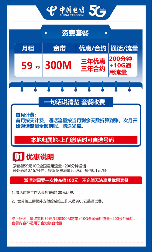 【河北省保定市】保定电信宽带融合套餐59元 300M 10G+200分钟