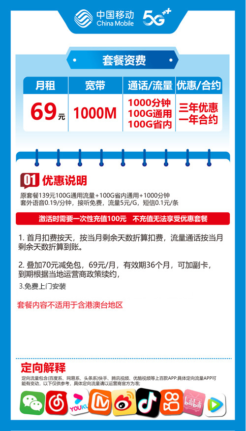 【河南省郑州市】郑州移动融合宽带 69元 1000M 200G+1000分钟 三年优惠套餐