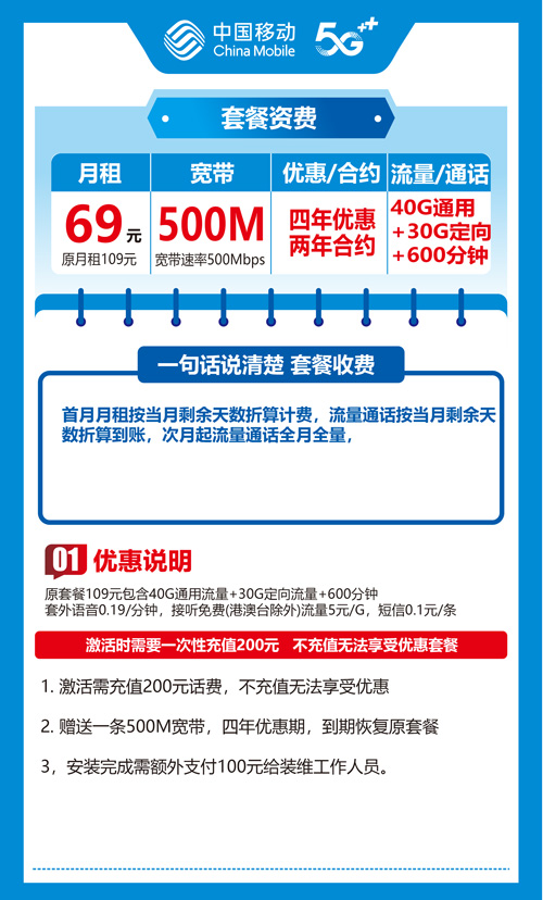 【江苏省常州市】常州移动宽带融合套餐 69元 500M 70G+600分钟 四年优惠套餐