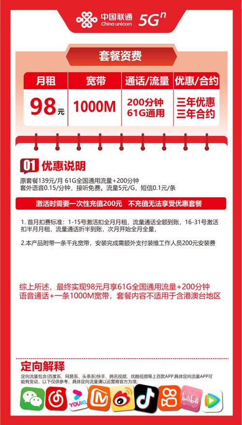 【辽宁省沈阳市】沈阳联通宽带融合套餐 98元 1000M 61G+200分钟 三年优惠套餐