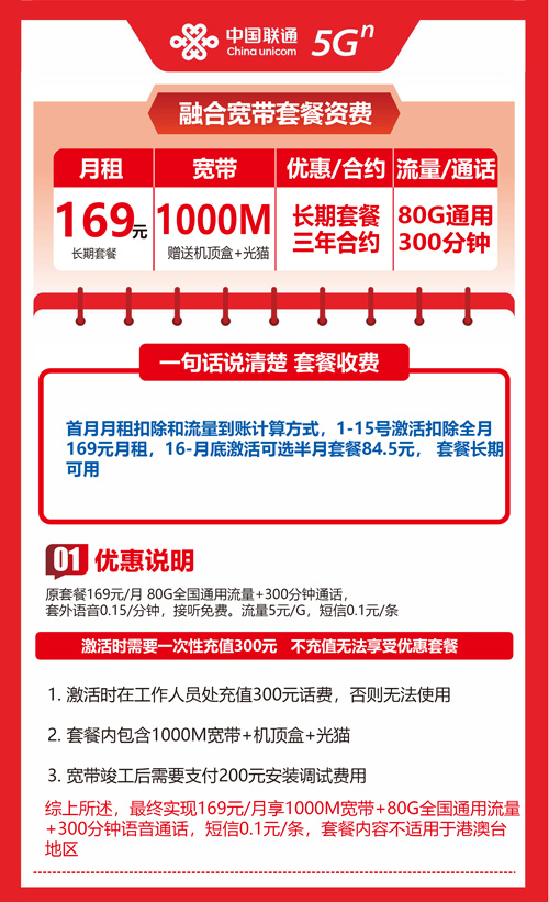 【宁夏】宁夏联通宽带融合套餐 169元 1000M 80G+300分钟