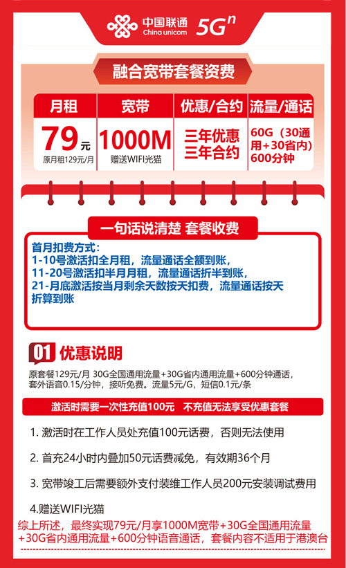 【山西省太原市】太原联通宽带融合套餐 79元 1000M 60G+600分钟 三年优惠套餐