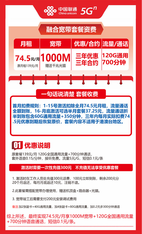 【四川省宜宾市】宜宾联通千兆宽带融合套餐 74.5元 1000M 120G+700分钟 三年优惠套餐