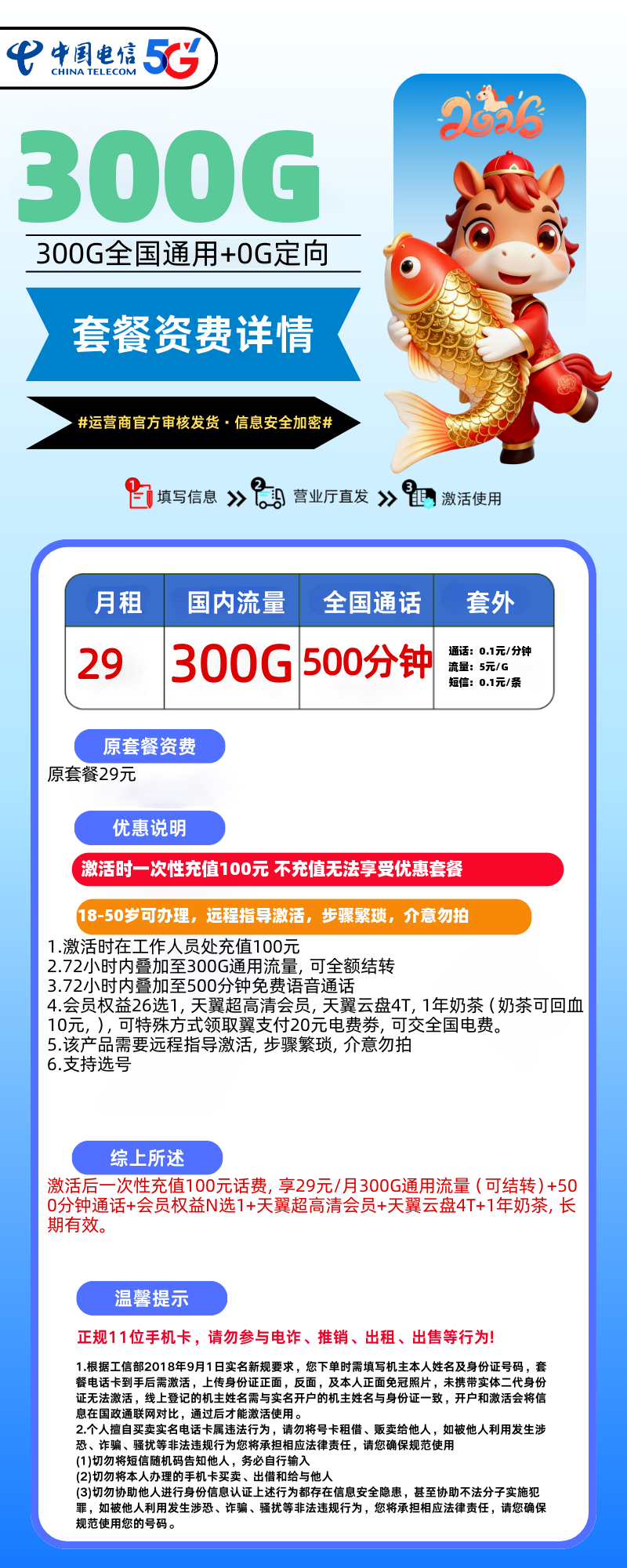 29元300G全国通用流量(可结转)500分钟全国免费通话,会员权益N选1+天翼超高清会员+天翼云盘4T+1年奶茶,还可特殊方式领取20元电费券,可交全国电费,长期套餐