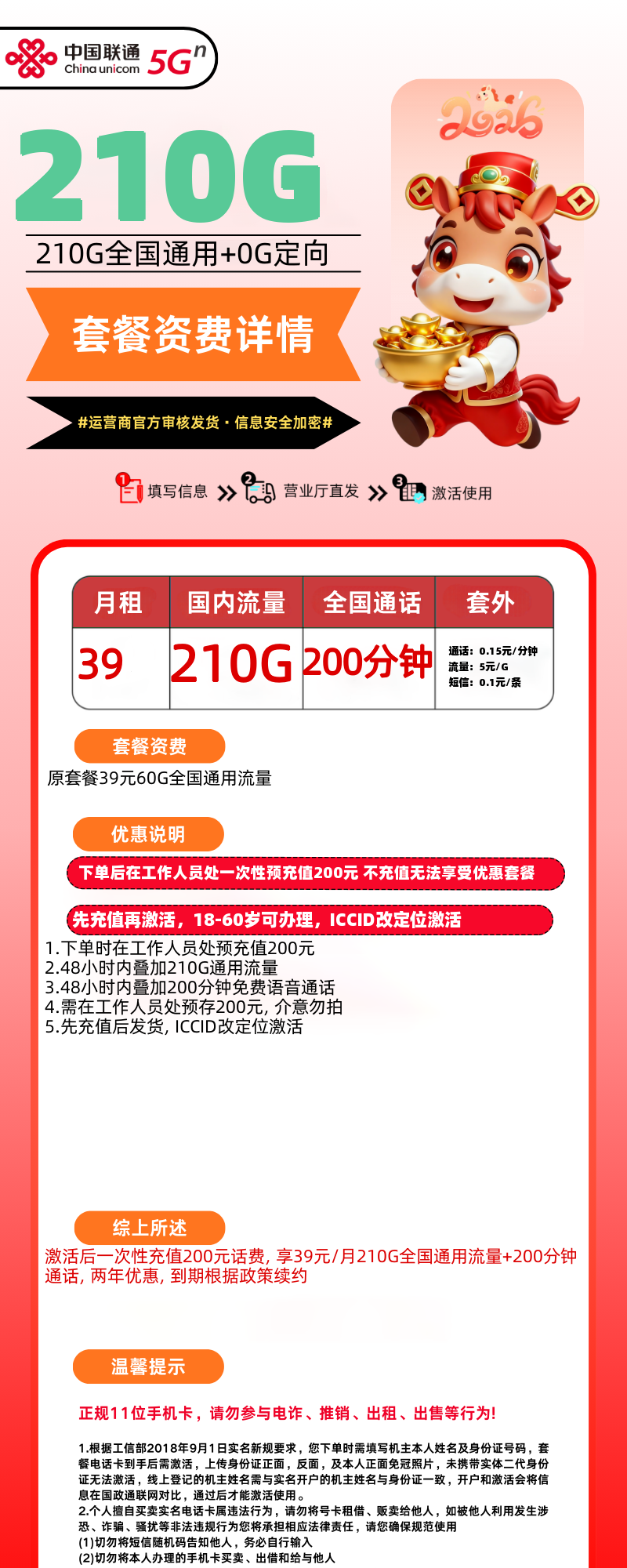 39元210G全国通用流量200分钟全国免费通话,两年优惠,到期可续