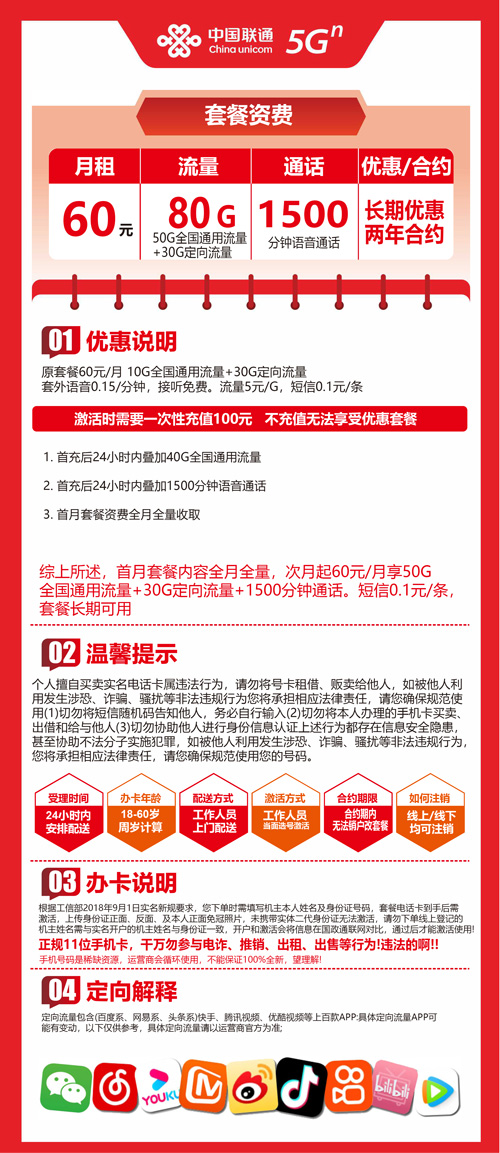 【贵州全省】联通60元 60G+2000分钟 首充100元 大语音卡