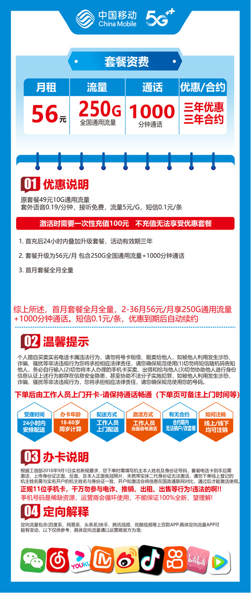 【新疆哈密】移动56元 250G+1000分钟 首充100元三年优惠套餐