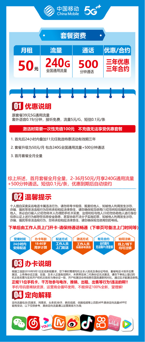 【新疆伊宁】移动50元 240G+500分钟 首充100元三年优惠套餐
