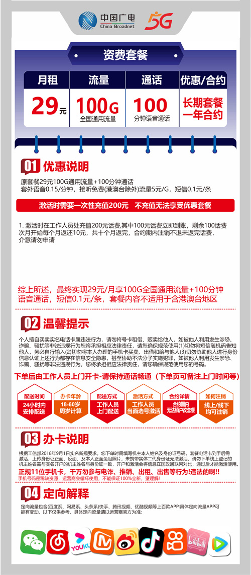 【河南洛阳】广电29元100G +100分钟 首充200元 长期套餐