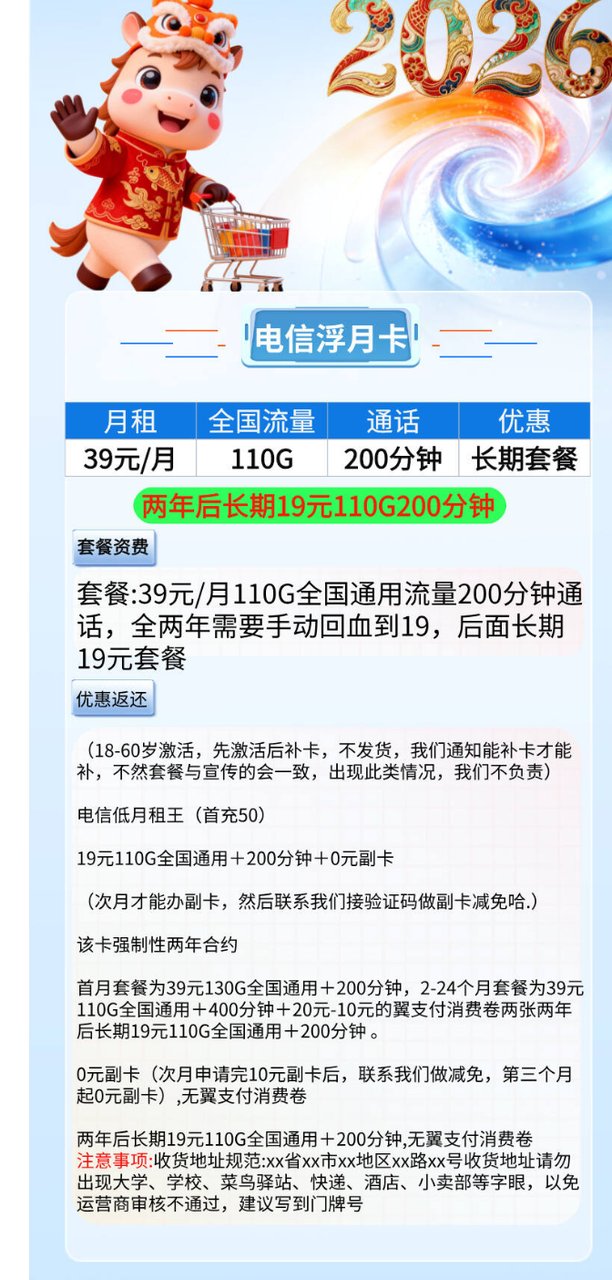 这个是前两年110G通话400分钟,前两年39,每月反翼支付20,第2个月申请副卡,后就长期19还是非常不错的