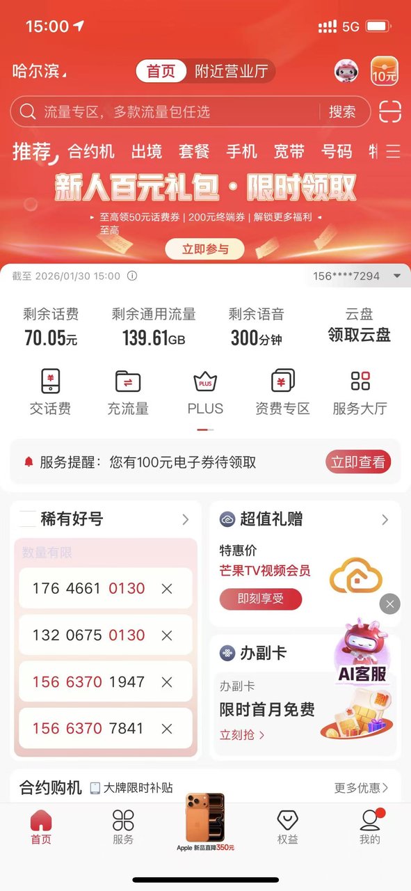 黑龙江联通300G+300分钟